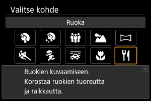 Käytä [] (Ruoka) ruokakuvien ottamiseen. Kohde näyttää kirkkaalta ja herkulliselta. Vähentää myös hehkuvalosta ja muista vastaavista valonlähteistä johtuvaa punertavaa sävyä.