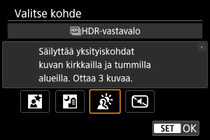 - Kuvatessasi riittävän kirkkaita kohteita, kuten normaalisti valaistuja kohteita, kuva voi näyttää luonnottomalta käytetyn HDR-tehosteen takia.