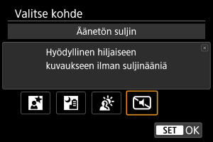 Kun vaaditaan hiljaisuutta, kuvata voi ilman äänimerkkejä tai laukaisimen vapautusääniä.