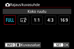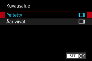 - [Kuvausalue]-asetus ei vaikuta näyttöön, kun [1,6x (rajaus)] on valittu tai käytetään RF-S/EF-S-objektiiveja.