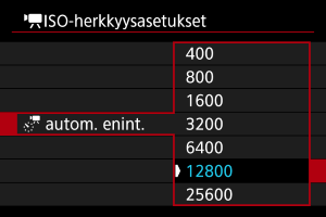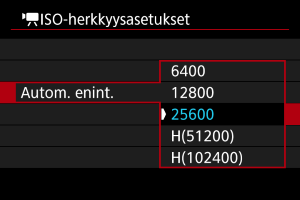 Voit asettaa enimmäisrajan videotallennuksen suurimmalle ISO-herkkyydelle tilassa [], [