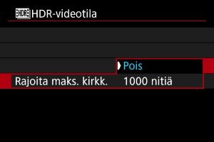 - [Pois]-asetuksella suurinta kirkkautta ei ole rajoitettu. Suositellaan katsottaessa kuvia näytöllä, joka tukee yli 1000 cd/m² näyttökuvaa.
