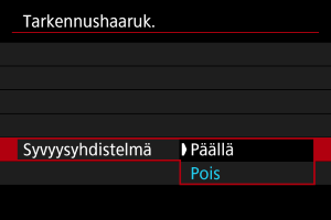 - Valitse [Pois], jos et halua kompensoida kuvan kirkkauden muutoksia tarkennushaarukoinnin aikana. Voit käyttää tätä asetusta muuhun kuin otettujen kuvien syväterävyyden säätöön Digital Photo Professionalin () tapaisissa sovelluksissa.