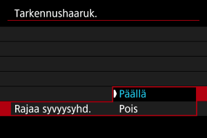 - [Päällä]-asetuksella kuva valmistellaan syväterävyyden säätöön korjaamalla kuvakulma rajaamalla, kun kuvakulma on riittämätön.