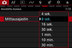 Voit määrittää mittausajastimen keston (ja määrittää valotuksen näytön / AE-lukituksen keston) sen jälkeen, kun jokin toiminto, kuten laukaisimen painaminen puoliväliin, käynnistää sen.