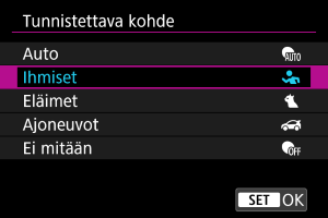 Kun valitset kohteen painamalla laukaisimen puoliväliin, voit valita seuraavat kohteet. Kun näkymissä ei ole asiaan liittyviä kohteita, kamera seuraa muita kohteita [Tunnistettava kohde] ‑asetuksesta riippumatta.