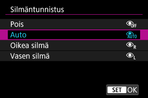 Voit kuvata niin, että tarkennat ihmisten silmiin, valitsemalla [: Silmäntunnistus] ‑asetukseen muun vaihtoehdon kuin [Pois] ().