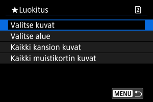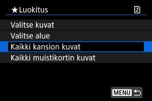 : Luokitus] asetuksen [Kaikki kansion kuvat] tai [Kaikki muistikortin kuvat], kaikki kansion tai kortin kuvat luokitellaan.