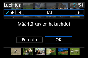 Voit suodattaa kuvien näytön hakuehtojen mukaan. Kun olet asettanut hakuehdot, voit toistaa ja näyttää vain löydetyt kuvat. Voit myös suojata, luokitella, toistaa kuvaesityksen, poistaa ja käyttää muita toimintoja suodatuille kuville.