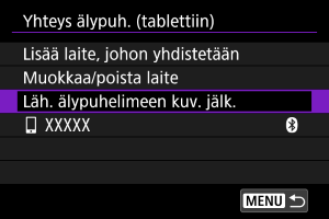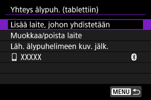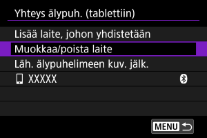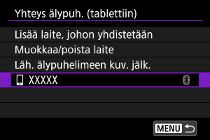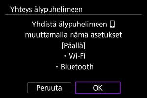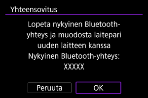 - Kameraa ei voi yhdistää kahteen tai useampaan laitteeseen samanaikaisesti Bluetoothilla. Kun haluat yhdistää eri älypuhelimeen Bluetooth-yhteydellä, katso Yhdistäminen uudelleen Wi-Fi-/Bluetooth-yhteydellä.