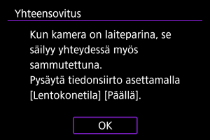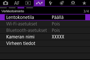 Jos et halua pysyä Wi-Fi-/Bluetooth-yhteydessä kameraan, kun sen virta on katkaistu, valitse [: Lentokonetila] ‑asetukseksi [Päällä] tai [