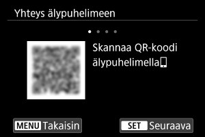 - Jos Camera Connect ‑sovellusta ei ole asennettu, skannaa näytöllä oleva QR-koodi älypuhelimella, siirry Google Play- tai App Store ‑kauppaan asentamaan Camera Connect ja aloita yhteensovitus painamalla sitten