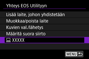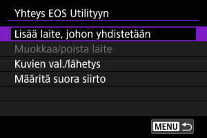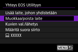 Katkaise Wi-Fi-yhteys ennen muiden laitteiden yhteysasetusten muokkaamista tai poistamista. Tässä osassa käsitellään kohdat, joita ei kuvailla kohdassa Kameran käyttäminen EOS Utility ‑ohjelmistolla.