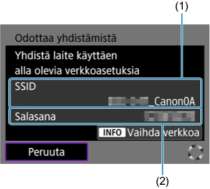 - Tarkista kameran näytössä näkyvä SSID (1) ja salasana (2).