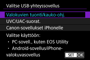 Valittuasi [UVC/UAC-suorat.]-vaihtoehdon luo yhteys tietokoneeseen liitäntäkaapelilla ja käynnistä sovellus sen jälkeen.