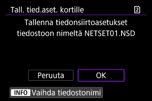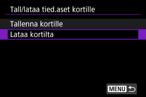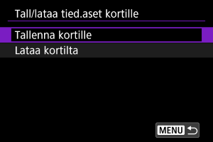 : Tall/lataa kam.aset. kortille] ‑toiminnon avulla voit tallentaa kaikki kameran tiedonsiirtoasetukset kortille tai ladata kaikki toisen kameran tiedonsiirtoasetukset kortilta.