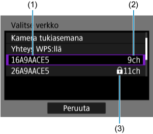 - Tyhjä tila kohdassa (2) tarkoittaa, että useita samannimisiä SSID-tunnuksia havaittiin. Kun valitaan SSID, jonka (2) on tyhjä, kamera yhdistää tukiasemaan, jonka signaali on voimakkain.