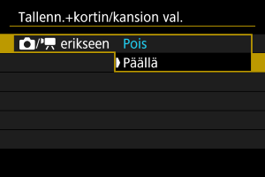 Valitse [Päällä], niin stillkuvien ja videoiden tallennustapa määritetään automaattisesti. Videot tallennetaan kortille ja stillkuvat kortille