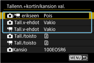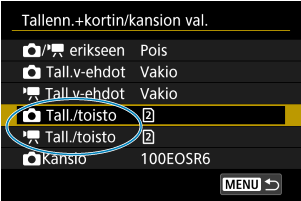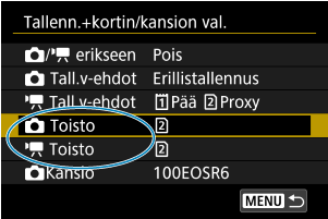 Tallennuksen/toiston valinta, kun kamerassa on kaksi korttia