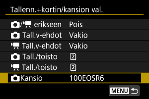 Kun kamerassa on kaksi korttia, voit määrittää tavan, jolla kamera tallentaa niihin, ja valita tallennukseen ja toistoon käytettävät kortit. Myös stillkuvien tallennuskansiot voi määrittää.