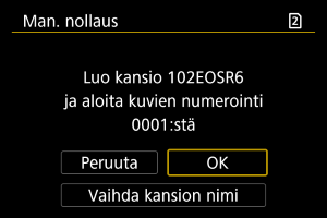 Kun nollaat kuvanumeroinnin manuaalisesti, uusi kansio luodaan automaattisesti ja siihen tallennettujen kuvien numerointi alkaa numerosta 0001.