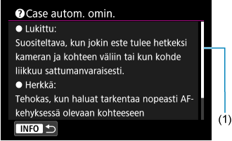 Kun näytössä näkyy [INFO Ohje], voit näyttää toiminnon kuvauksen painamalla INFO-painiketta. Poistu ohjenäytöstä painamalla sitä uudelleen. Kun vierityspalkki (1) näkyy oikealla, voit vierittää näyttöä kääntämällä Pikavalitsin 1-valintakiekkoa.