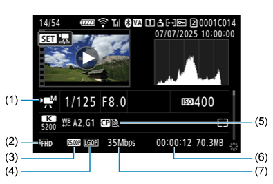 - Yksinkertaisuuden vuoksi kohdassa Stillkuvien perustietonäyttö selitettyjä kohteita ei selitetä tässä.