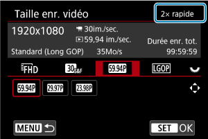 Les vidéos capturées au moyen de l'enregistrement ralenti/accéléré sont lues au ralenti ou en accéléré. Le son n'est pas enregistré. Réglez la vitesse du ralenti ou de l'accéléré (vitesse de lecture) dans [: Taille enr. vidéo].