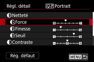 - En sélectionnant [Rég. défaut] à l'étape 3, vous pouvez ramener les réglages des paramètres du style d'image correspondant aux valeurs par défaut.