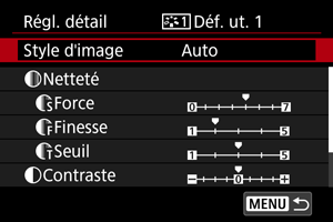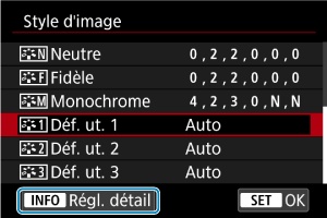 - Si un style d'image est déjà enregistré sous [Déf. ut. *], la modification du style d'image de base effacera les réglages de paramètre du style d'image défini par l'utilisateur précédemment enregistré.