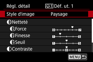 Vous pouvez sélectionner un style d'image de base tel que [Portrait] ou [Paysage], l'ajuster à votre guise et l'enregistrer sous [Déf. ut. 1] à [Déf. ut. 3]. Pratique lors de la création de plusieurs styles d'image avec des réglages différents.