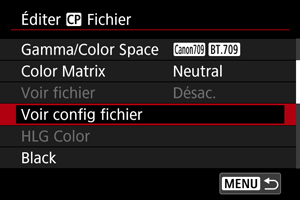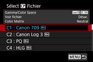 - Un fichier Look enregistré ne peut pas être utilisé si vous modifiez les réglages [Gamma/Color Space], [HLG Color] ou [Over 100%] après l'enregistrement.