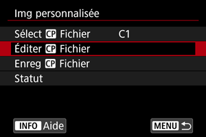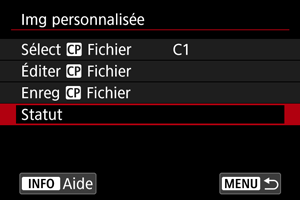 Vous pouvez vérifier les réglages des fichiers d'images personnalisées à partir du menu [Img personnalisée].