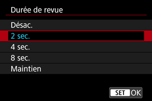 Pour conserver l'image affichée immédiatement après la prise de vue, réglez sur [Maintien], tandis que si vous préférez ne pas afficher l'image, réglez sur [Désac.].