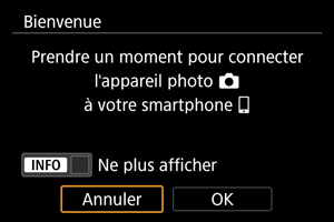 Les instructions de connexion à un smartphone s'affichent si vous sélectionnez [OK] lorsque l'écran de configuration apparaît ().