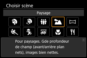 Utilisez [] (Paysage) pour de vastes paysages, afin de maintenir les sujets proches et éloignés nets. Pour des bleus et des verts vifs, ainsi que des images nettes et lumineuses.