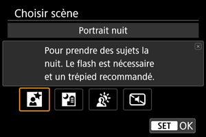Utilisez [] (Portrait nuit) pour de magnifiques photos lumineuses de personnes avec des scènes nocturnes en arrière-plan. Veuillez noter que dans ce mode, un flash externe est nécessaire. L'utilisation d'un trépied est recommandée.