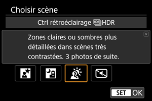 - La fonction Ctrl rétroéclairage HDR peut rester sans effet pour les scènes en contre-jour violent ou les scènes au contraste très élevé.