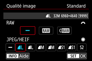 Vous pouvez sélectionner le nombre de pixels et la qualité d'image. Les options de qualité d'image JPEG/HEIF sont les suivantes : /