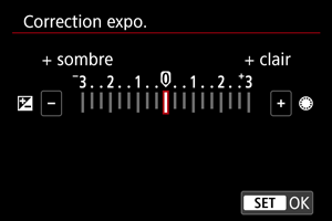 : Correction expo.] (lors de l'enregistrement vidéo) et réglez la valeur de la correction d'exposition sur cet écran.