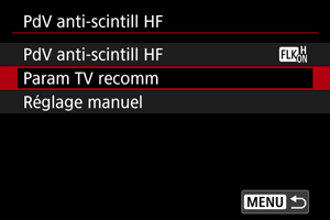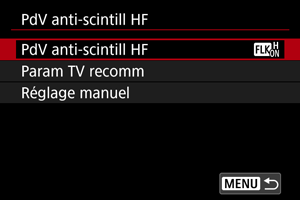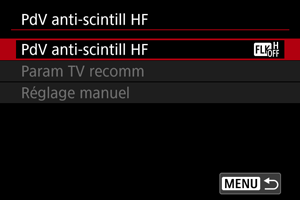- Avant la prise de vue anti-scintillement haute fréquence, envisagez de régler [