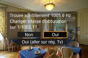 L'appareil photo détecte les sources lumineuses de 50,0 à 2 011,2 Hz et affiche une vitesse d'obturation adaptée à la prise de vue sous des sources lumineuses qui scintillent à des fréquences élevées. Vous pouvez ensuite basculer sur la vitesse d'obturation indiquée.