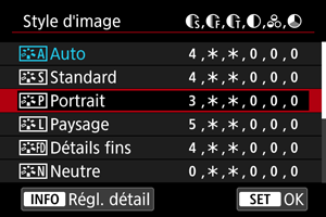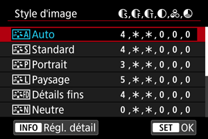 - Si un style d'image est déjà enregistré sous [Déf. ut. *], la modification du style d'image de base effacera les réglages de paramètre du style d'image défini par l'utilisateur précédemment enregistré.