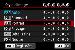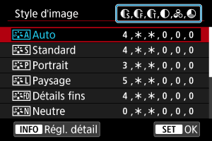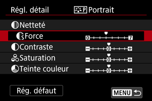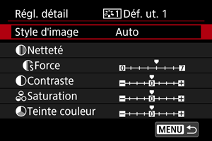- En sélectionnant [Rég. défaut] à l'étape 3, vous pouvez ramener les réglages des paramètres du style d'image correspondant aux valeurs par défaut.