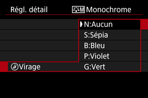 Vous pouvez personnaliser un style d'image en le modifiant par rapport aux réglages par défaut. Pour en savoir plus sur la personnalisation de [Monochrome], voir Réglage Monochrome.
