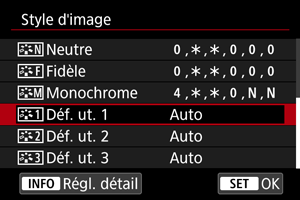 - Pour photographier avec un style d'image enregistré, sélectionnez le paramètre [Déf. ut. *] enregistré, puis photographiez.