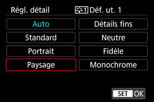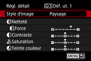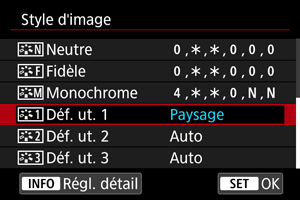 Vous pouvez sélectionner un style d'image de base tel que [Portrait] ou [Paysage], l'ajuster à votre guise et l'enregistrer sous [Déf. ut. 1] à [Déf. ut. 3]. Pratique lors de la création de plusieurs styles d'image avec des réglages différents.