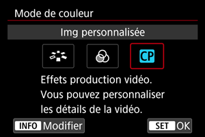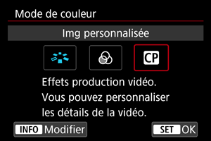 - Pour désactiver le réglage des couleurs en fonction des fichiers Look, sélectionnez [Désac.].