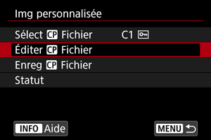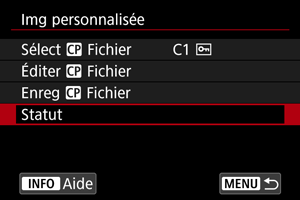 Vous pouvez vérifier les réglages des fichiers d'images personnalisées à partir du menu [Img personnalisée].