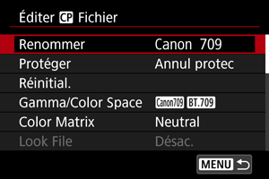 - Un fichier Look enregistré ne peut pas être utilisé si vous modifiez les réglages [Gamma/Color Space], [HLG Color] ou [Over 100%] après l'enregistrement.